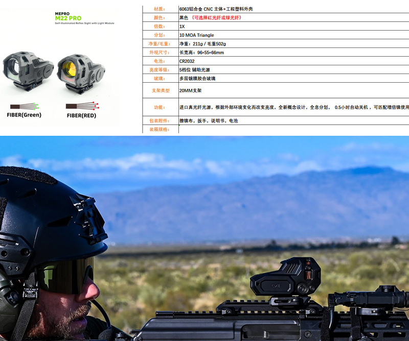 高質量M22 Pro小跑車戶外真光纖探測瞄準器膠合玻璃超輕五檔調節