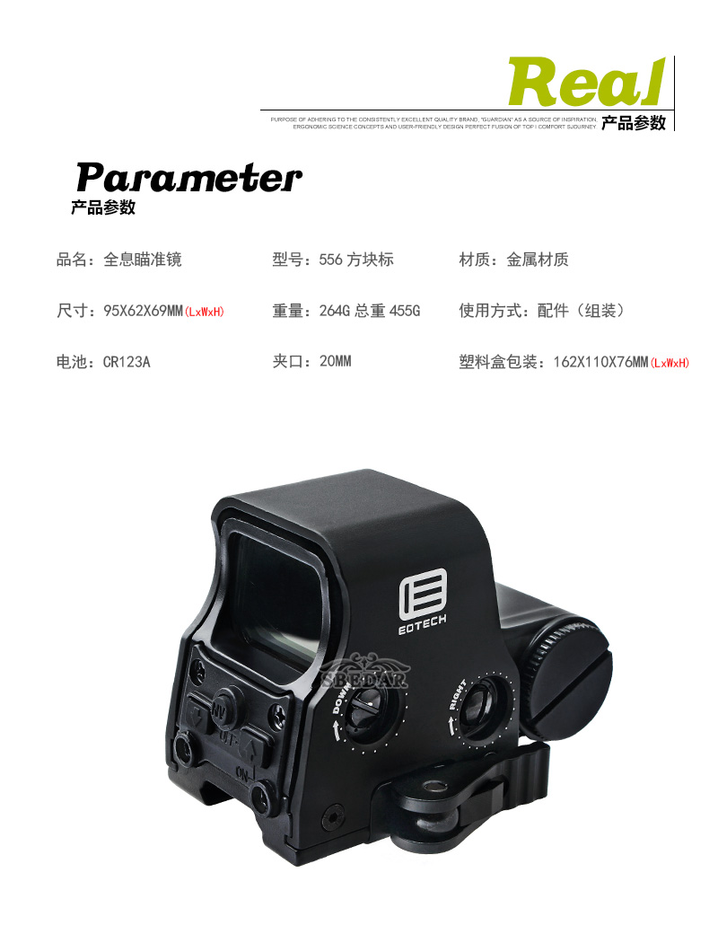 快拆556內紅點瞄準鏡照明方式:紅綠。導軌:20MM全息瞄準鏡的分劃圖像亮度增加時,將伴隨圖像周圍出現光暈,這是正常物理現象,在物理原理上是不可避免的。只要通過亮度調節,能使光暈濺弱即可